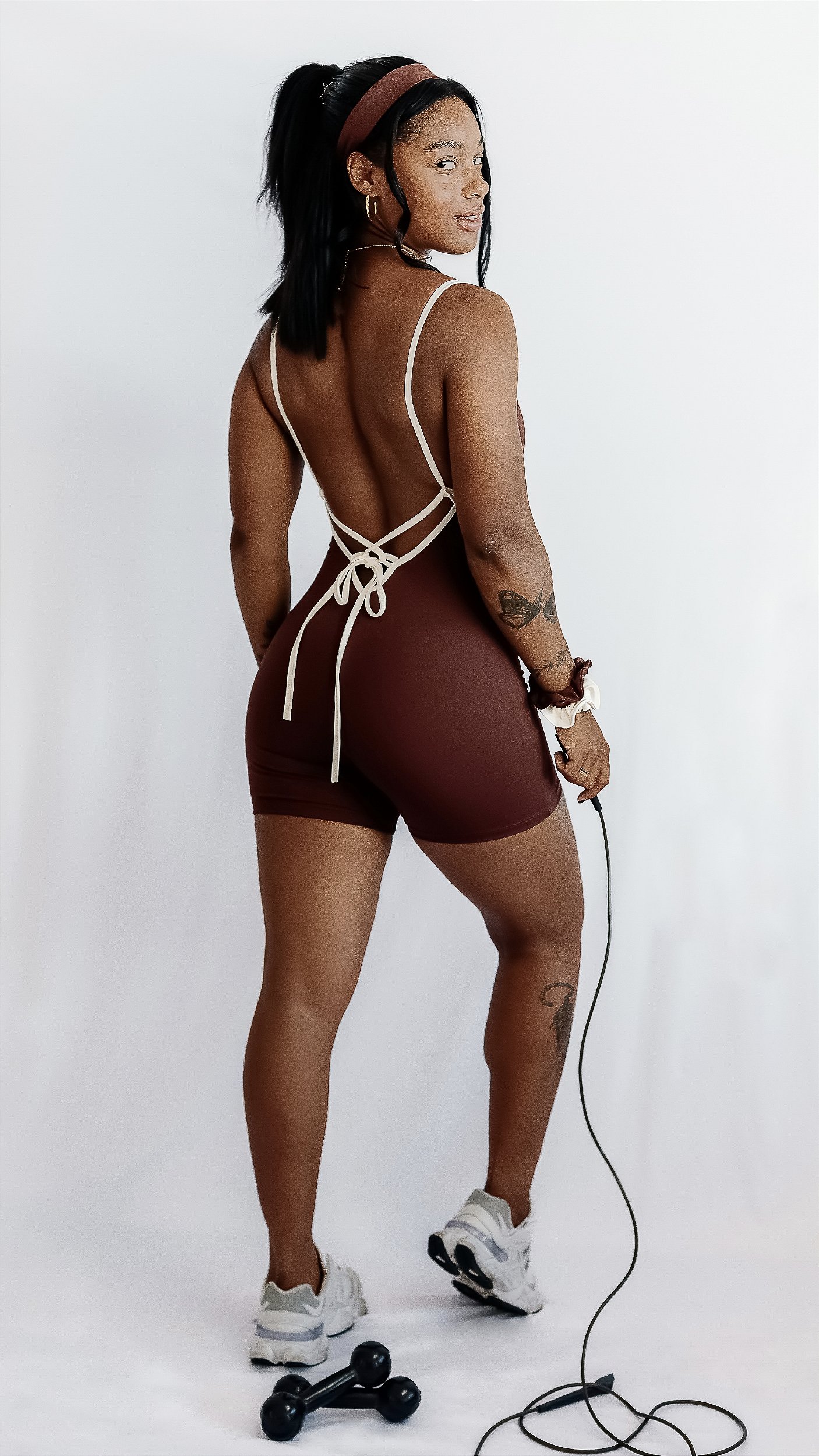 Macaquinho marrom amarração decote costas suplex - PORLE
